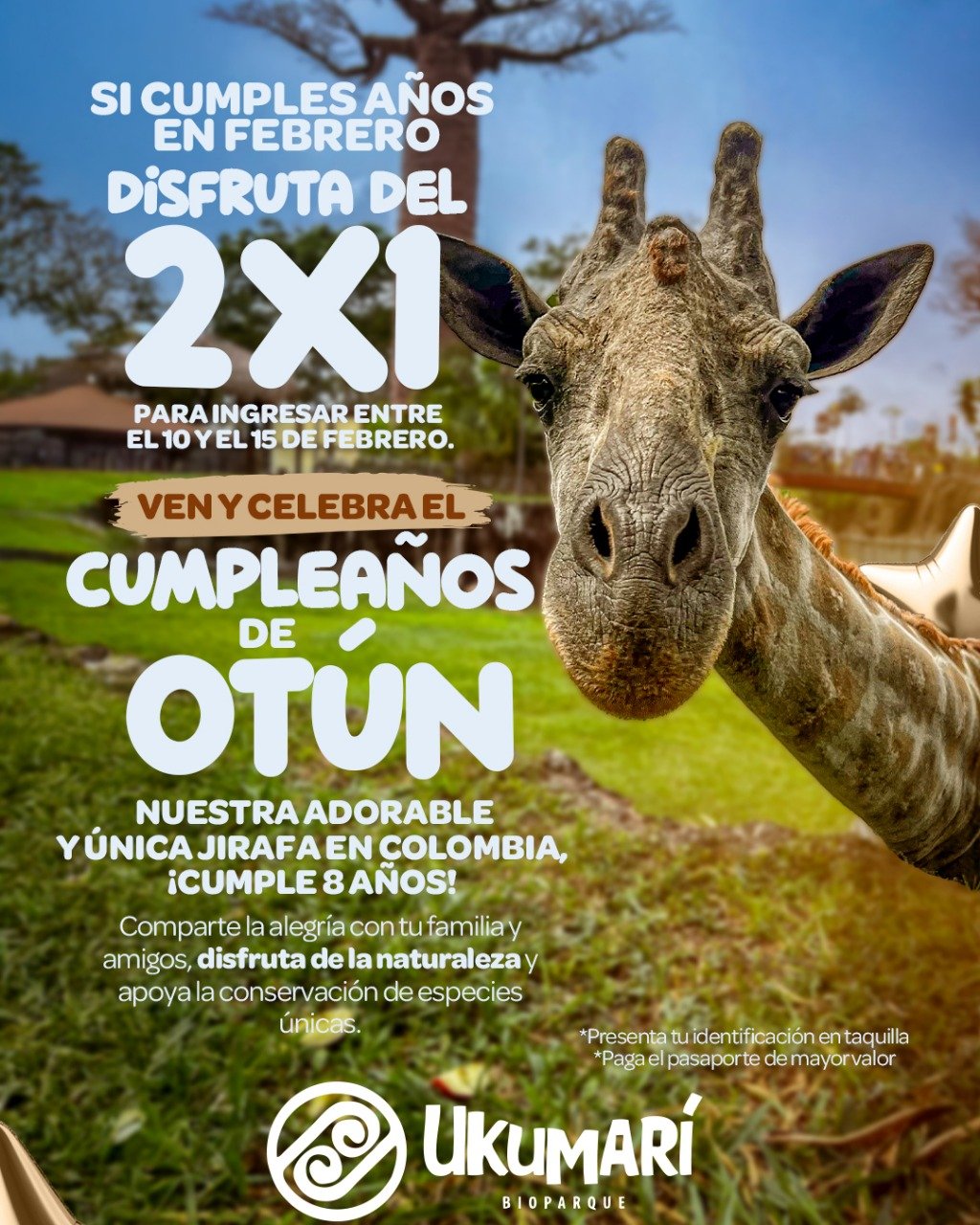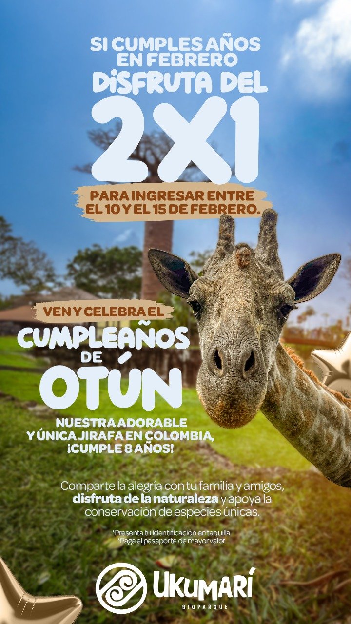 Al respecto, Raúl Murillo Betancur, gerente del Bioparque Ukumarí informó que «Este lunes cumple años uno de los más queridos en el Bioparque, Otún, nuestra única jirafa que habita en Colombia; es una jirafa que todos queremos, que conocemos su historia. Cumple 8 años y queremos celebrarlo con todos los pereiranos, dando un descuento de 2×1 pagando la boleta de mayor valor”.