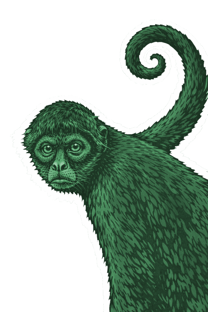 El mono araña mulato es un gran trepador que contribuye a la salud del bosque al mantener abiertas las copas de los árboles con su movimiento, permitiendo la entrada de luz y aire para otras plantas y animales.